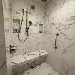 The bathroom includes a shower, a double jacuzzi, double sinks, and Hansgrohe fixtures.