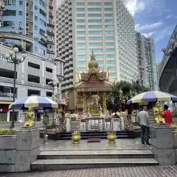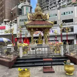 What you find here is a Thai style shrine that is an open structure covered by an ornamental multi-tiered roof. In the centre is resting a gilded Buddha figure with four faces, one looking in each direction. At the corners of the square shaped monument are golden elephants. Other decorative elements of the monument can be viewed well from all sides.