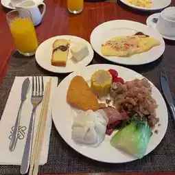 Breakfast was just an additional $100 in the package. Buffet breakfast is available for two persons. Cheap, but not too small of a variety of food. It tastes good. The restaurant's decoration is also very new. It doesn't feel like a 𡚒 hotel.