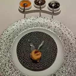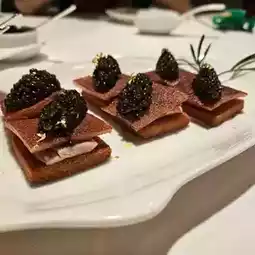 Composed of Qiandao Lake black fish roe sauce, suckling pig and breadcrumbs.