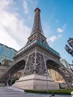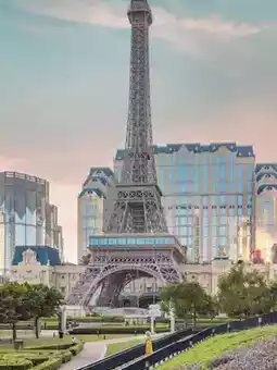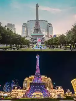 And there are also many brand-name shops to shop. The replica of the Eiffel Tower, we can go up to see the view.