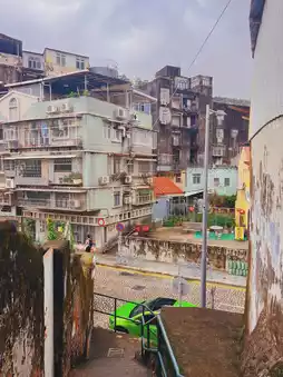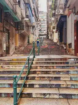 11. Escada do Coxo: A photogenic spot, pink buildings, all the way to the sea, with the Macau Tower in the background