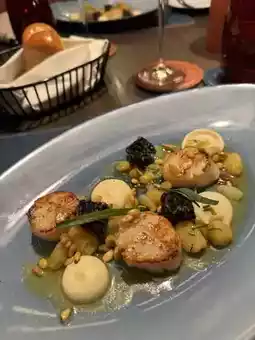 For starters, the large scallops paired with cauliflower, black pudding, roasted pine nuts, and raisins create a unique blend of flavors, with the sweetness of the raisins and the crunchiness of the pine nuts.