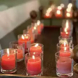There are no stained glass windows in the church. The pale yellow walls are simple and bright, and the lighting is natural.