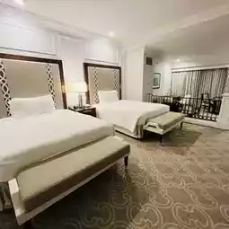 The room is very large. There is a small living room besides the two beds