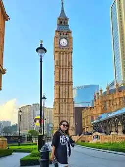 Another popular photo spot in Macau is the London Replica, which has a beautiful and magnificent replica of the Big Ben clock tower. You can take photos from any angle and they will look great. Inside, there are hotels and shopping malls decorated in a very British style. Outside, there is a bridge connecting you to a high angle view, which is very beautiful. Many people come here to take photos. I really like this spot. It is fun to take photos, and it is beautiful both day and night when the lights are on.
