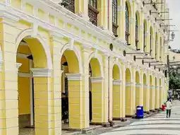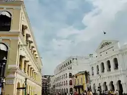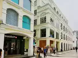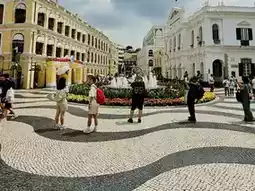 The square's ground is paved with beautiful black and white wave-patterned tiles, showcasing a unique artistic style and adding a romantic atmosphere to the area. The surrounding buildings combine Portuguese and Chinese styles, highlighting Macau's multicultural essence and giving a strong sense of exoticism.