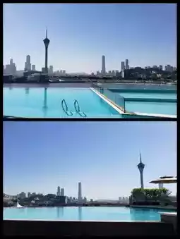 As you enter the hotel room through the large glass window, the Macau Tower, the bridge and the infinity pool come into view. Sitting on the windowsill, you can read a book and look at the sea, which is very comfortable. As for the bathroom, there are two wash basins with plenty of space, a bathtub for a bubble bath, and a Japanese automatic toilet. It is overall clean and comfortable. The price ranges from a few hundred to over a thousand yuan. There is a shopping mall with Galeries Lafayette and many restaurants downstairs. Now there is another new and cost-effective hotel option for people going to Macau.