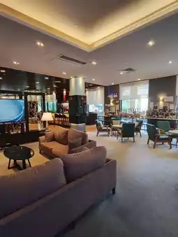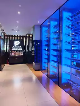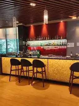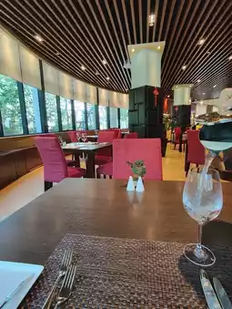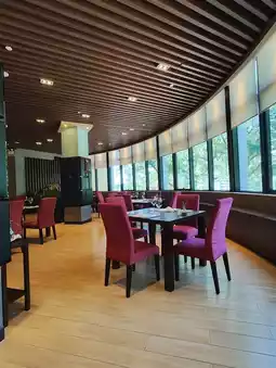Upon entering the restaurant, you first see a large wine cellar, a spacious sofa area, and a bar. There is ample distance between the tables, with arched glass walls, natural lighting, and a green view.
