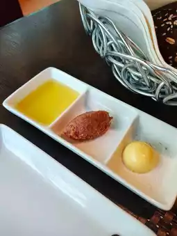 First, a complimentary bread basket is served, with three types of homemade specialty bread, accompanied by butter, olive oil, and a sauce made with Portuguese sausage.