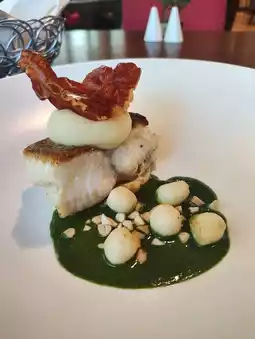 For the main course, I chose 🐟sea bass with 24-month Bísaro ham, celery root puree, almonds, garlic spinach, and cream sauce. ❤️💚🤍 The red, green, and white color combination is very attractive. The fish is fresh, tender, and juicy, with crispy skin. 🥓Bísaro ham has a texture similar to Taiwanese pork paper, and its salty flavor enhances the dish. The celery root puree is smooth, lighter, and fresher than mashed potatoes. The almonds add a unique nutty aroma to the dish, and the almond pieces enrich the texture.