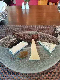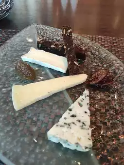 For dessert, I chose a 🧀cheese platter with Brie, cheddar, and blue cheese, accompanied by jam, honey pecans, and rye nut breadsticks. The blue cheese is extremely strong.