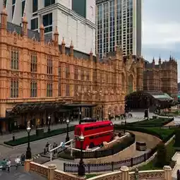 The Londoner Macao, the most popular hotel in Macau, which looks like England has been brought to Macau. The exterior is a replica of the Palace of Westminster, the Houses of Parliament, and the Big Ben clock tower of England. There is also a corner for taking photos with the red double-decker bus, a symbol of England. Let me tell you that the decoration here is very beautiful. At night, there will be lights, colors, and sounds that are even more beautiful. Anyone who visits Macau must not miss stopping by to take beautiful check-in photos.