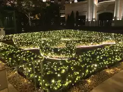 The starry sky lights change color, blending dreamily with the green trees and bright flowers.