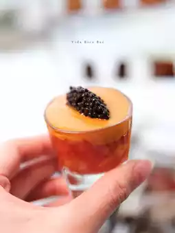A base of sweet and sour tomatoes and vegetables with smoked caviar is fresh and appetizing
