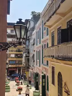 Nestled to the left of the Ruins of St. Paul’s, this blush-colored fold of a street, spanning no more than 50 meters, weaves one of Macau’s sweetest time traps. Flanked by Portuguese-style buildings coated in peach and pastel yellow hues, with wrought-iron balconies draped in cascading bougainvillea, the cobblestone path shimmers under the midday sun, radiating a honey-like glow—an accidental masterpiece as if God had spilled His palette.