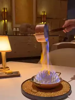 🍰 For dessert, we ordered the visually stunning Flame Snow Mountain: the outer layer of cream mousse filling was burned with edible alcohol and ignited, echoing the raspberry ice cream inside. The attractive presentation of fire and ice is very suitable for holiday celebrations🥳