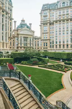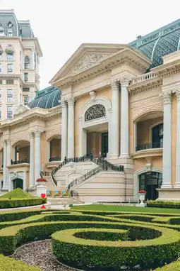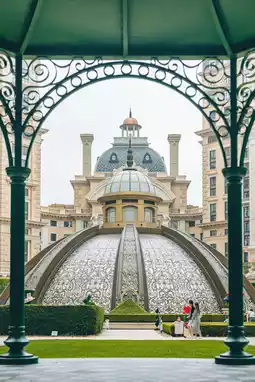 2️⃣: You can climb up to the Grand Lisboa Palace Pavilion behind the dome sculpture for a bird's-eye view of the entire garden and the East-meets-West architecture (as shown)
