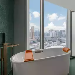 🛏️ The room is open directly! It’s so cool to switch to “Cyberpunk Mode” with one click! The panoramic floor-to-ceiling windows offer a panoramic view of the beautiful scenery of Macau, and are matched with cool laser light strips. The dark bathtub has a full sense of ceremony, and even the toilet is intelligent voice-controlled, taking the sense of technology to the MAX!