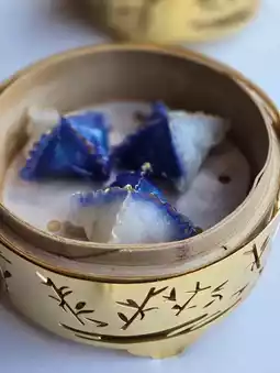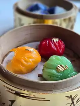 Another steamed dish was the Parisian Garden Crystal Blue Shrimp Dumplings, likely their signature item. Made with sashimi-grade blue shrimp, I’ve seen similar quality at 8½ Otto e Mezzo Bombana. The dumplings came in three different colors, beautifully shaped, and adorned with gold flakes—presentation was top-notch. However, the colored wrappers didn’t differ in taste, and the sticky texture of the dough made them a bit tricky to eat.