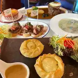 Rich and tangy tomato soup filled with chunks of fruit, paired with crispy puff pastry rolls. Once dipped, the rolls soak up the soup, blending soft and crispy textures that instantly captivate your taste buds.