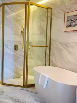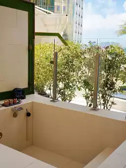 The hot spring is located in the outdoor garden of the room, where you can sit and enjoy views of the Macau Tower and the city skyline.