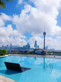 The infinity pool offers a stunning backdrop of the Macau Tower, making it a great spot for Instagram-worthy shots.