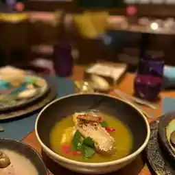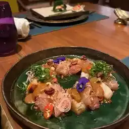Entering the restaurant was an enchanting experience! The waiter guided us through a bar designed with inspiration from old British stables. He gently knocked on a door adorned with horsewhips, which slowly opened to reveal exquisite Thai textiles and artwork. As we followed the waiter further, vibrant lanterns came into view, and our reserved table was set right beneath these colorful lights, creating a magical and ceremonial atmosphere ❤️