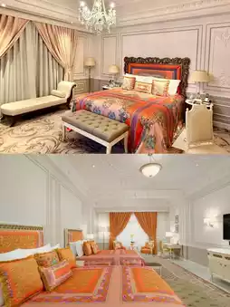 2. Each room has luxurious satin bedspreads with unique designs. The furnishings, from faucets and toiletries to bathtubs, embroidered bathrobes, door handles, and even toilet paper holders, all bear the iconic Medusa emblem. High-end furniture and comfortable bedding ensure an exceptional stay.