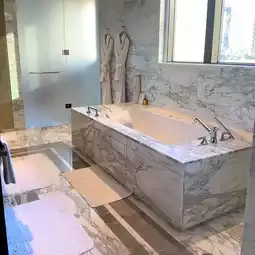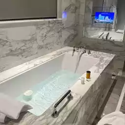 A bathroom so big that you can get lost in it is absolutely epic! The **black onyx massage bathtub** in the center can accommodate 6 people. When you pour in the bath salt, the butler will light the sandalwood essential oil that is prepared synchronously. The dressing room has a hidden secret - by pressing a button, the entire mirror cabinet rotates into a **professional dressing room**, and even the hair dryer is a gold-plated Dyson limited edition.