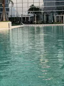 The infinity pool at Conrad Macao is nestled within the hotel’s lush garden, offering a tranquil retreat amidst the bustling city—a perfect embodiment of urban resort luxury. Surrounded by verdant greenery, the pool’s mirror-like surface reflects the surrounding architecture, creating an elegant and picturesque scene.