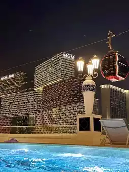 As the sun set beneath the golden canopy of Wynn Palace, I stepped into the legendary infinity pool. The scene before me was like a silent painting, with the pool stretching to the edge of the lake, reflecting the palace's cable cars and the rhythmic fountains—a dreamlike spectacle.