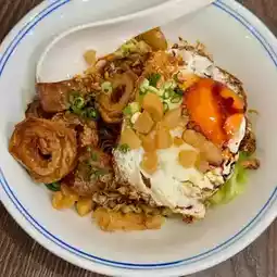 Noodles tossed with pork lard and topped with a runny egg and braised intestines—so flavorful, it'll blow your mind!