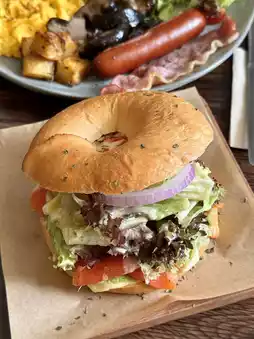 Must order the "Western-style breakfast plate"! The sunny-side-up egg is fried until it is oozy, and then it is pierced and wrapped with charred bacon and crispy sausage. The toast is spread with butter and put into the mouth, and it is served with fresh mixed vegetable salad. It is salty, sour and sweet at once~ "Salmon Avocado Bagel" is the face value! The smoked salmon is spread into a flower shape, sandwiched with thick-cut avocado and rocket vegetables. The bagel is just the right toughness, and it makes a "crackling" sound when bitten. It is super delicious with lemon wedges~