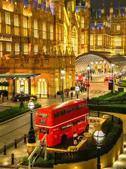 • Overhead shot of the red bus stop on the flyover, full of British street views