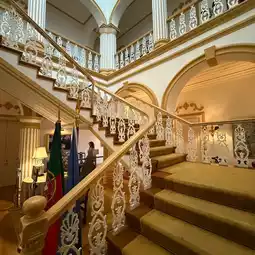 2️⃣ Revolving staircase: Marble steps with golden handrails, shot from top to bottom, retro blockbuster easy to handle.