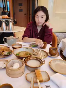 The meal included Chinese tea, dim sum, congee, wonton noodles, and fresh fruits, all beautifully arranged on a table. Sitting around the table in pajamas, I enjoyed a relaxed and comfortable dining experience.