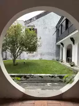 1. **Moon-shaped Door Frame**: The circular window wall at the entrance creates a "picture-within-a-picture" effect.