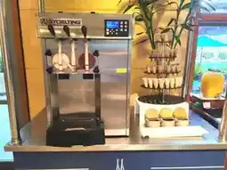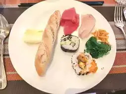 Food options include a salad bar, sushi, sashimi, Japanese snacks, frozen seafood, soups, bread, instant noodles, sausages, cheese, hot dishes, grilled meats, grilled vegetables, drinks, fruit, desserts, soft serve ice cream, and more.