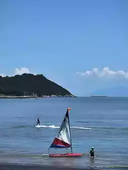A rare sandy beach secret in Macau, with crystal-clear water and colorful houses by the shore giving a Mediterranean vibe