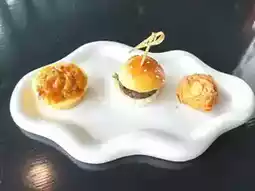 Hot Dishes: Salmon Tart with Hollandaise Sauce, Almond and Minutewort Cheese Ball, Mini Beef Burger with Truffle and Foie Gras