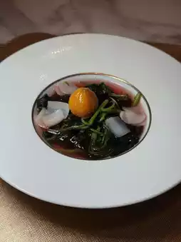 This is one of Chef Tam's signature dishes, made with carefully selected Iberian black pork from Spain, using the premium part around the pork neck. Through a secret cooking method, the dish achieves an ultra-thin crispy coating, bursting with rich aroma and leaving a lingering taste. Besides the pork, it is paired with five ingredients of varying acidity, such as pickled ginger, young ginger, pineapple, and rice vinegar, each offering a unique tangy flavor.