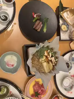The food is beautifully presented. Since it's autumn, the presentation is full of autumnal elements, such as maple leaves.