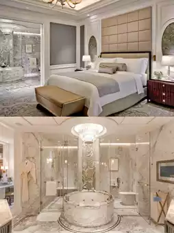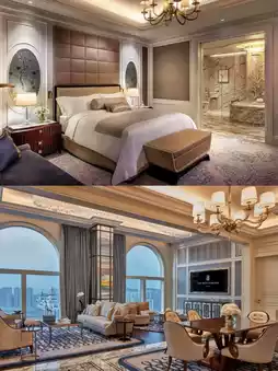 This Ritz-Carlton is located in the Galaxy Macau integrated resort, situated on Avenida da Amizade, a super convenient location. The hotel's design aesthetics perfectly match my taste, blending modern luxury with a romantic vibe. What impressed me most was the floor-to-ceiling windows in the room, offering a panoramic view of Macau’s bustling cityscape. The dazzling lights at night are simply breathtaking 🌃 The marble bathroom design paired with a semi-open bathtub lets you enjoy the outside view while soaking—truly a divine experience~