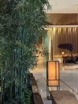 The lobby is elegant, with decor featuring bamboo, floor lamps, white sofas, and clean lines, creating a tranquil and comfortable atmosphere. It's ideal for small gatherings or leisurely relaxation. The service is attentive and courteous, giving the feeling of being in a high-end Japanese hotel.