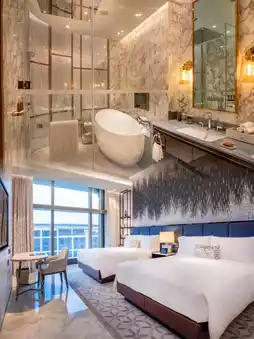 Opening the room door, I was amazed by the city view through the floor-to-ceiling windows. By day, the sleek lines of Macau Tower; by night, the dazzling lights of countless homes—just zoning out here becomes a pleasure. The bathroom’s double vanity design truly understands women—no more fighting for space with your companion. Paired with the hotel’s specially blended bath amenities, it washes away the day’s fatigue, making your skin feel like it’s breathing.