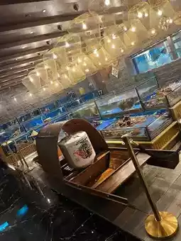 There is an oversized seafood market with fresh seafood ingredients that can be cooked to order