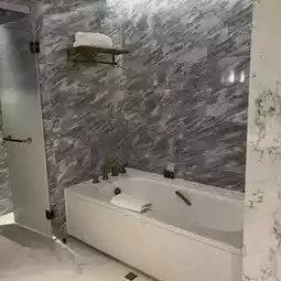 The toilet space is super large with a large bathtub and dry and wet separation
