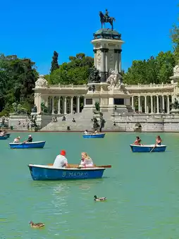 4️⃣ Philosophical Boating in Retiro Park: Rent a wooden boat and float through the reflection of the Crystal Palace, watching the sunset gild the Monument to King Alfonso XII.
