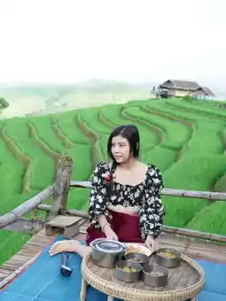 If you want to experience nature in its purest form, we highly recommend Ban Pa Bong Piang in Chiang Mai. This is a unique stay in a small wooden house located right in the middle of terraced rice fields. The house is simple, featuring only a bedroom with a mattress, mosquito net, and a small balcony for dining. There is no electricity, only solar-powered lights and water sourced from a nearby waterfall.